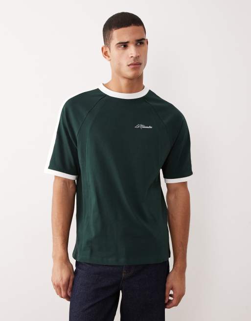 ASOS DESIGN heavyweight relaxed raglan t-shirt with panelling and social club graphic in dark green