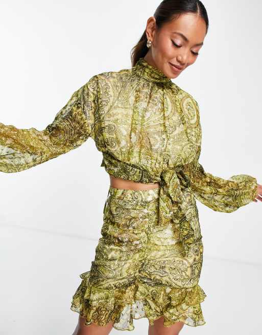 ASOS DESIGN high neck top with tie front detail in fil coupe paisley print (Part of a co-ord)