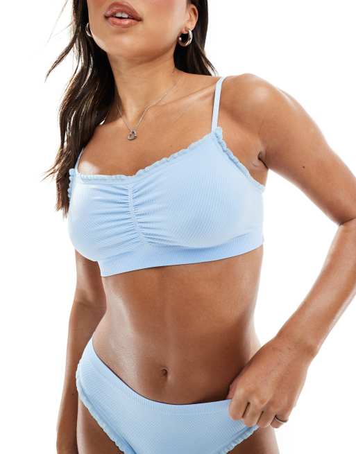 ASOS DESIGN Jilly ribbed crop bralet with ruffle trim in blue