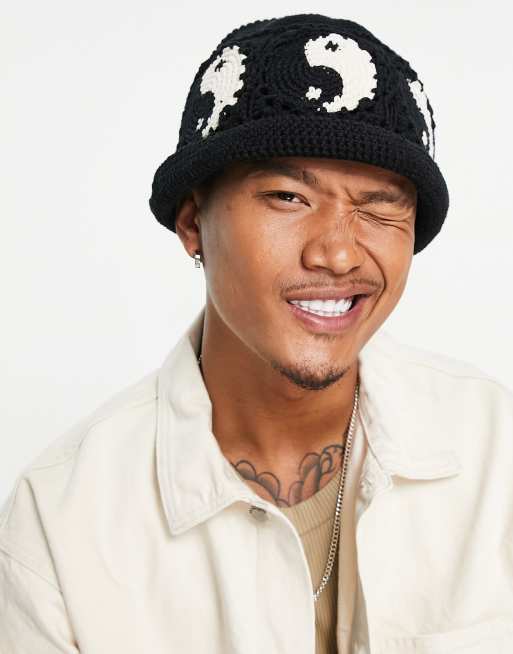 ASOS DESIGN knitted bucket hat in black and white with yin yang