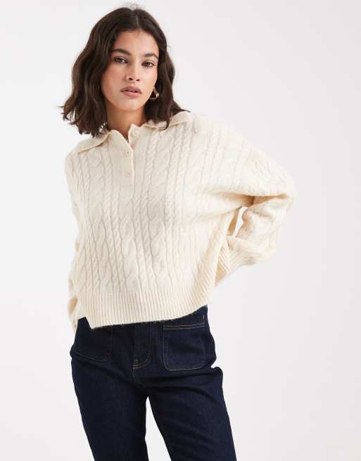 ASOS DESIGN knitted cable polo top in cream