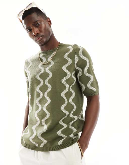 ASOS DESIGN knitted crew neck t-shirt in textured khaki wiggle pattern
