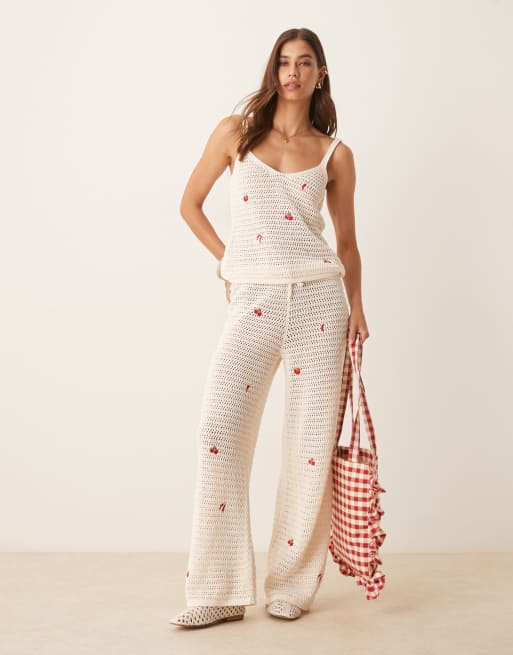 ASOS DESIGN knitted pants with fruit embroidery in ecru