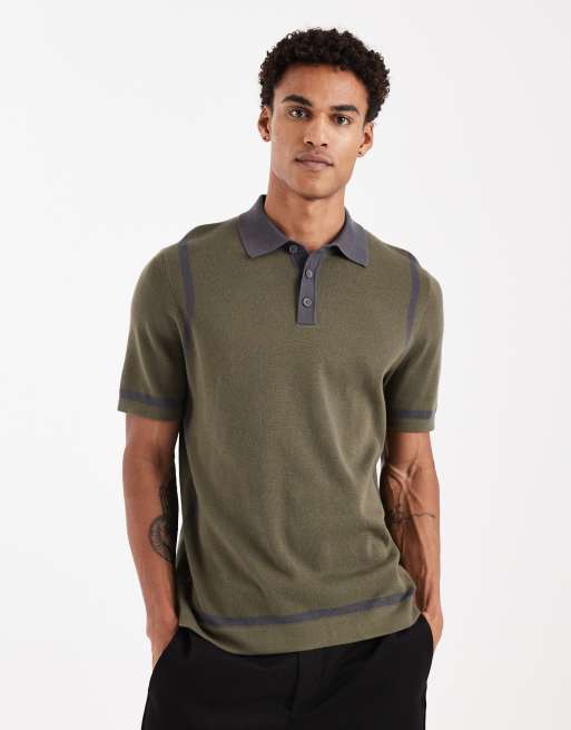 ASOS DESIGN knitted polo with panel detail in khaki and grey
