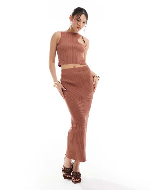 ASOS DESIGN knitted rib midaxi skirt in brown (part of a set)