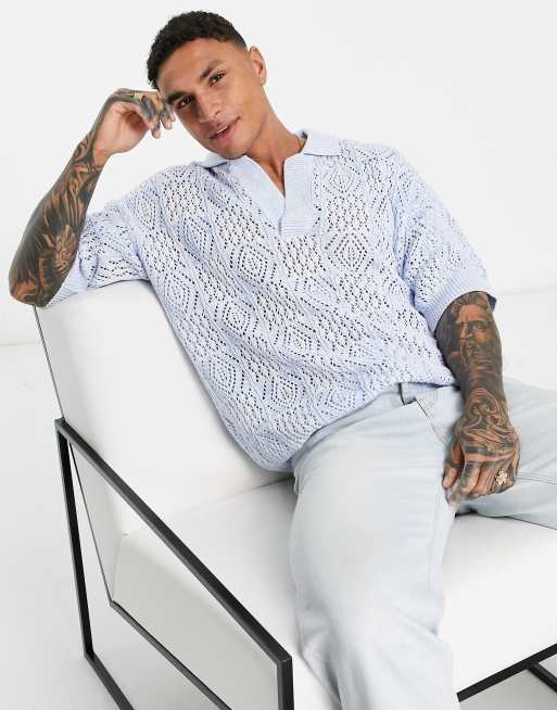 ASOS DESIGN knitted short sleeve oversized pointelle notch polo in blue