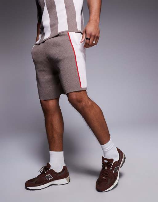 ASOS DESIGN knitted textured shorts with side stripe in stone (Part of a set)