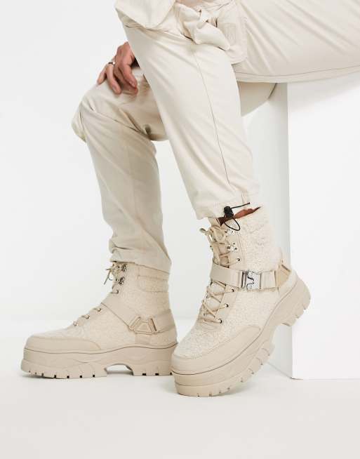 ASOS DESIGN lace up boot in beige borg with strap detail on chunky sole