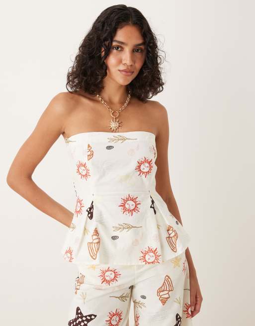 ASOS DESIGN linen blend cinch waist bandeau top in holiday print (part of a set)