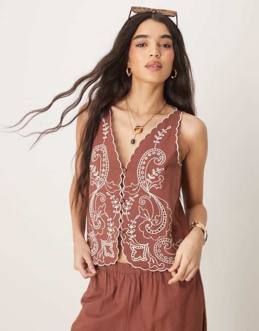 ASOS DESIGN linen blend scallop edge embroidered waistcoat in chocolate (part of a set)