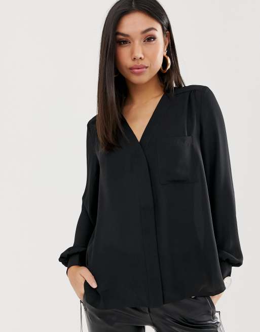 ASOS DESIGN long sleeve blouse with pocket detail in Black