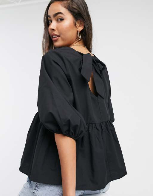ASOS DESIGN long sleeve cotton smock top with peplum hem in black
