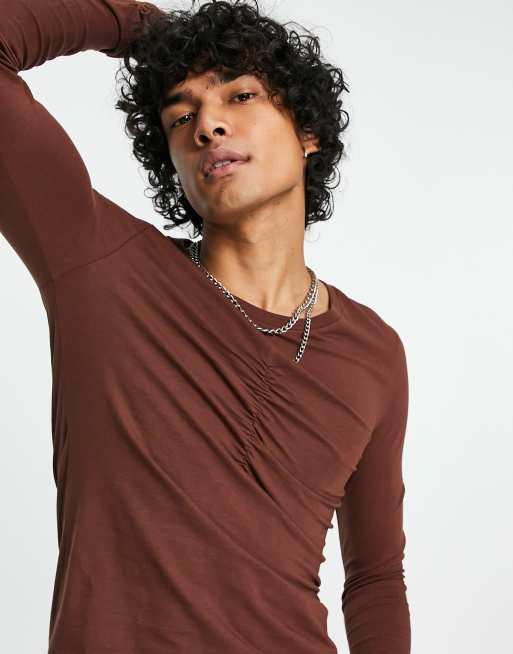 ASOS DESIGN long sleeve muscle fit t-shirt with ruching in brown