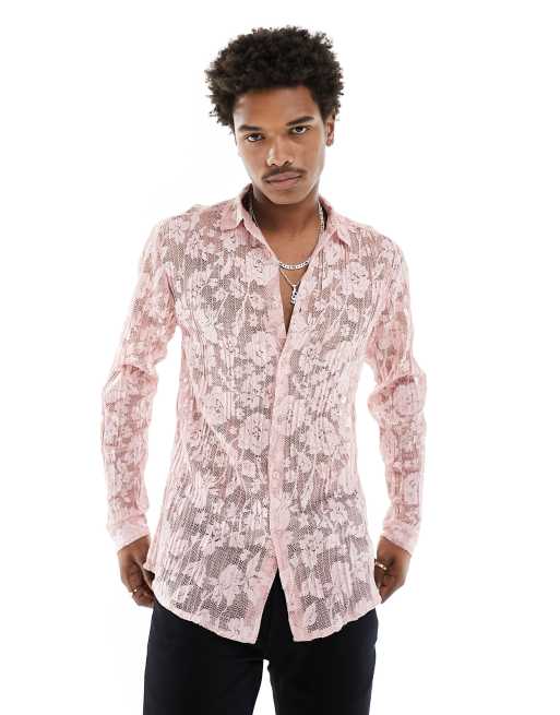 ASOS DESIGN long sleeve plisse lace shirt in light pink