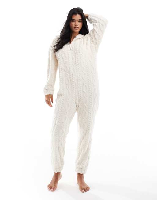 ASOS DESIGN lounge cable textured cloud fleece onesie in cream