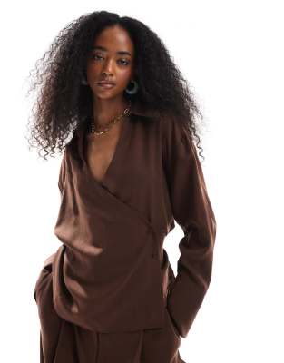ASOS DESIGN lyocell wrap tie detail shirt in chocolate (part of a set)