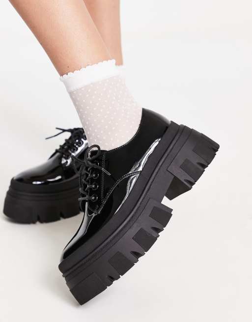 ASOS DESIGN Magda chunky lace up flat shoes in black patent
