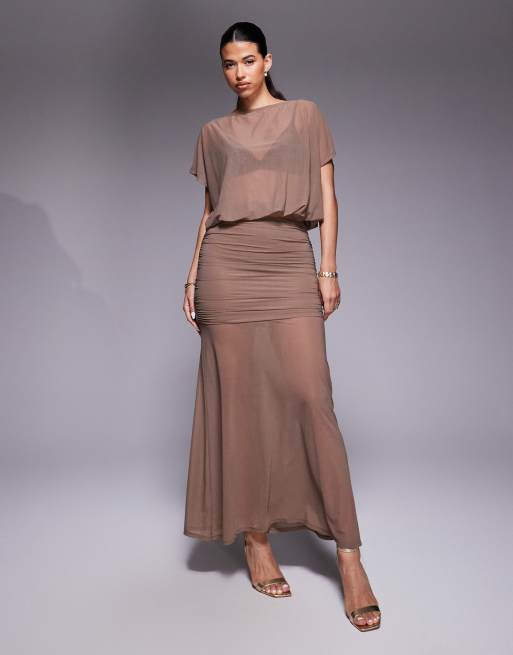 ASOS DESIGN mesh boat neck top and maxi skirt set in brown