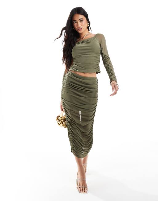 ASOS DESIGN mesh long sleeve ruched one shoulder top and maxi skirt set in khaki