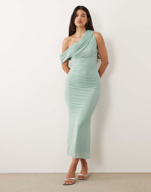 ASOS DESIGN mesh off shoulder drape maxi dress with ruching detailing in blue