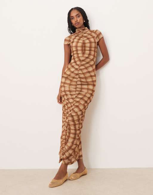 ASOS DESIGN mesh short sleeve ruched midi dress in check
