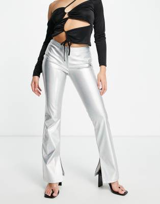 ASOS DESIGN metallic silver flare pants with split hem
