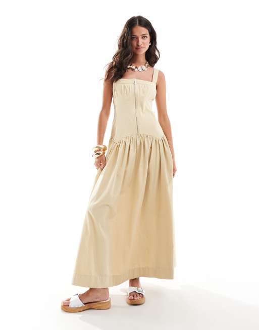 ASOS DESIGN midi zip front corset hem twill smock dress in stone