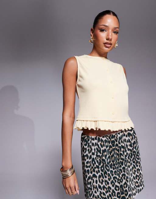 ASOS DESIGN mini rib button through top with mini frill hem in buttermilk