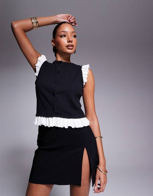 ASOS DESIGN mini rib monochrome button through top with frill shoulder in black