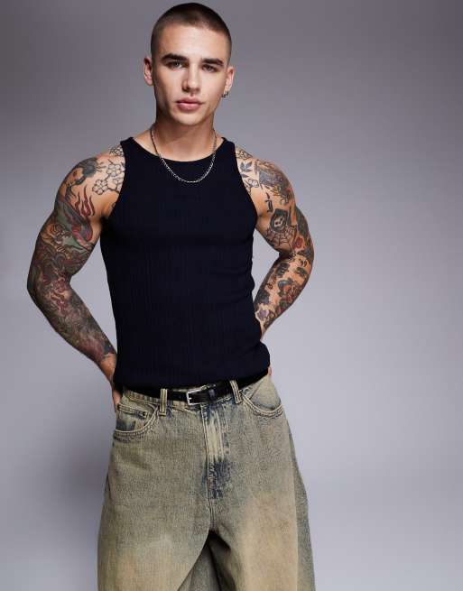 ASOS DESIGN muscle fit high scoop singlet in navy striped texture