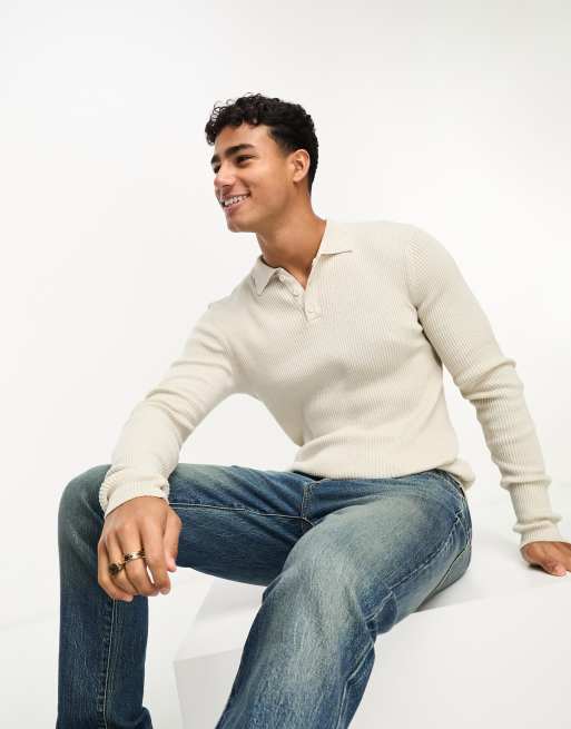 ASOS DESIGN muscle fit knitted essential polo jumper in oatmeal