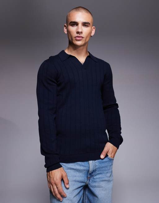 ASOS DESIGN muscle fit long sleeve knitted rib notch neck polo shirt in navy