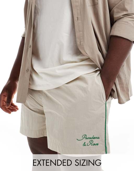 ASOS DESIGN nylon shorts in ecru with green piping