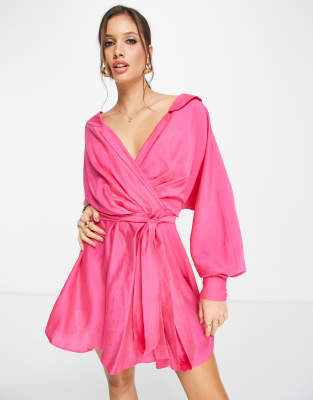 ASOS DESIGN off shoulder mini shirt dress with tie detail in washed fabric in pink