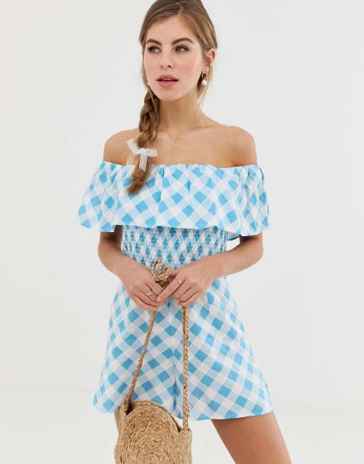 ASOS DESIGN off shoulder ruffle playsuit with shirring in gingham print