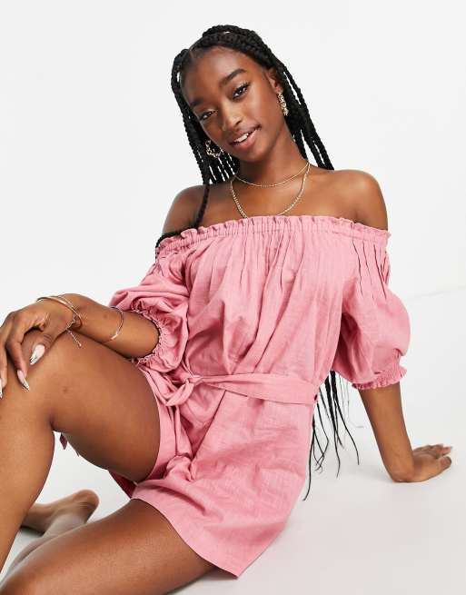 ASOS DESIGN off-the-shoulder crinkled belted playsuit in blush