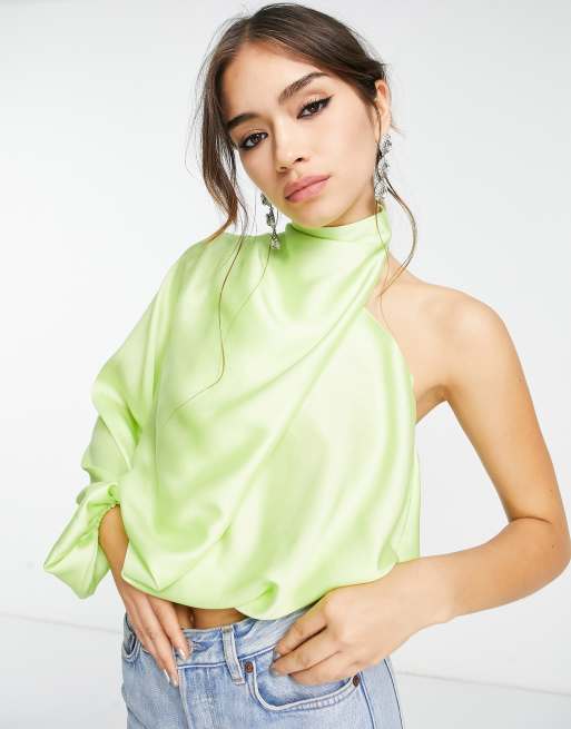 ASOS DESIGN one sleeve cropped blouse with cowl drape neck in green