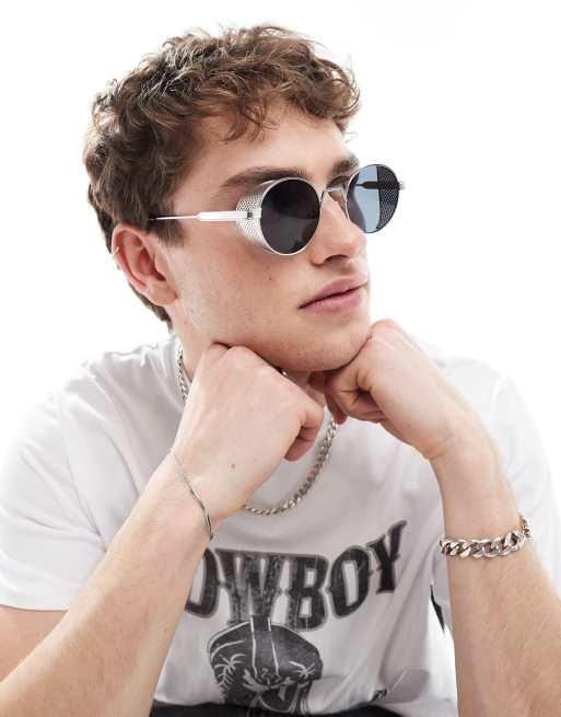 ASOS DESIGN oval metal sunglasses with grids in silver