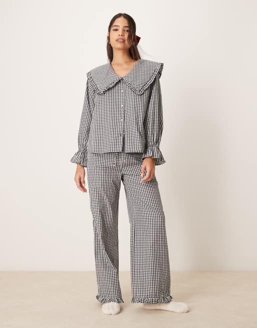 ASOS DESIGN oversized collar shirt and frill hem pants pyjama set in black gingham