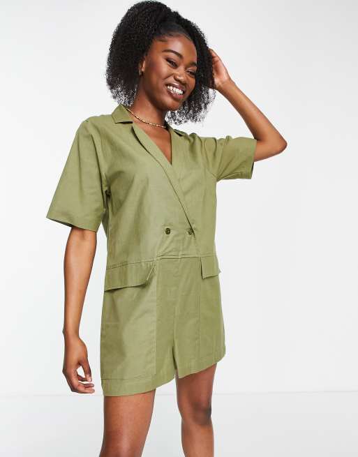 ASOS DESIGN oversized double breasted romper in khaki
