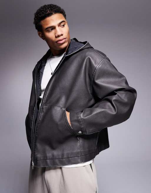 ASOS DESIGN oversized faux leather jacket with hood in washed black
