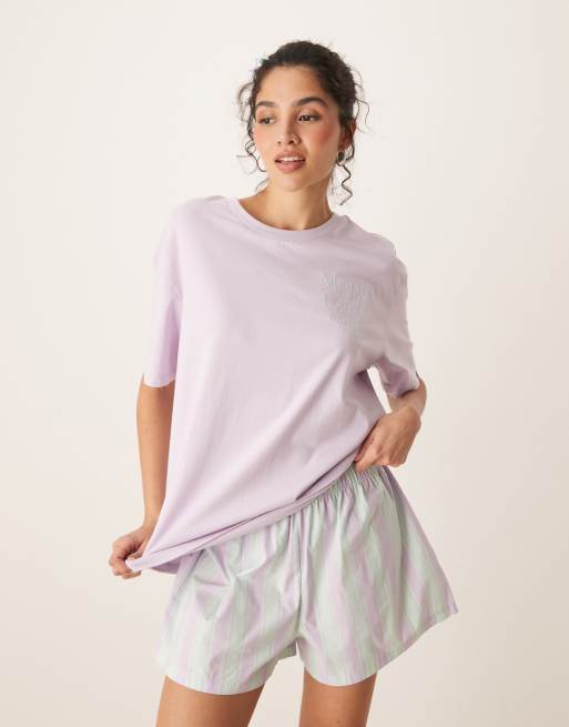 ASOS DESIGN oversized graphic tee & woven stripe boxer shorts pyjama set in lilac
