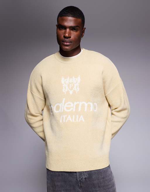 ASOS DESIGN oversized knitted chenille jumper with Palermo graphic in stone