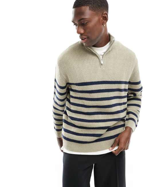 ASOS DESIGN oversized knitted fisherman rib 1/4 zip jumper in stone and navy stripe