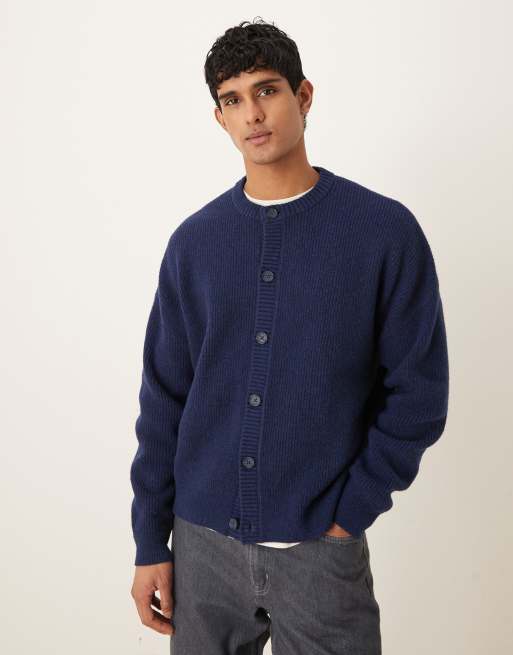 ASOS DESIGN oversized knitted fisherman rib wool-blend crew neck cardigan in navy