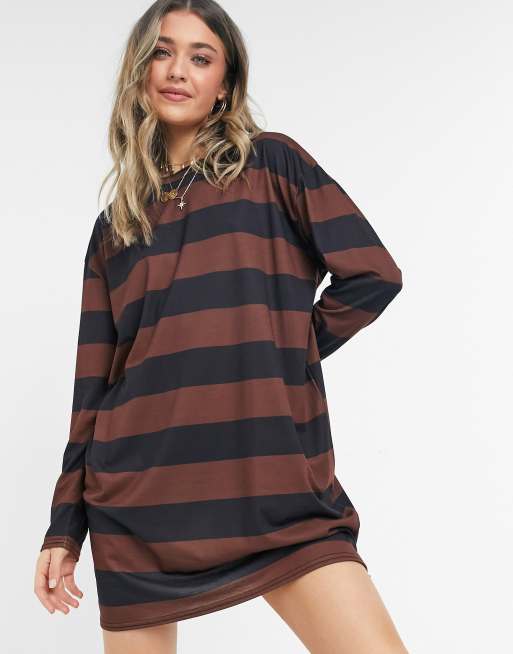 ASOS DESIGN oversized long sleeve t-shirt dress in chocolate brown and black stripe