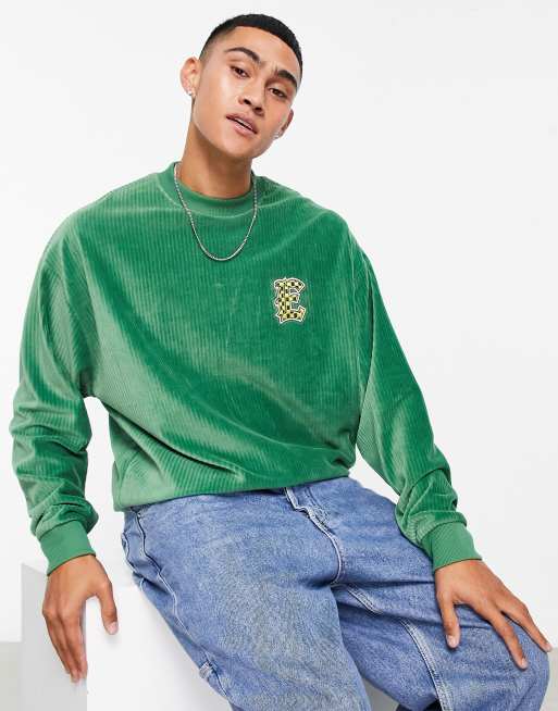 ASOS DESIGN oversized sweatshirt in green ribbed velour with varsity badge