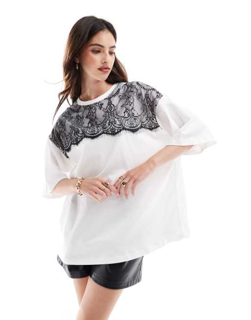 ASOS DESIGN oversized t-shirt with contrast lace detail in white