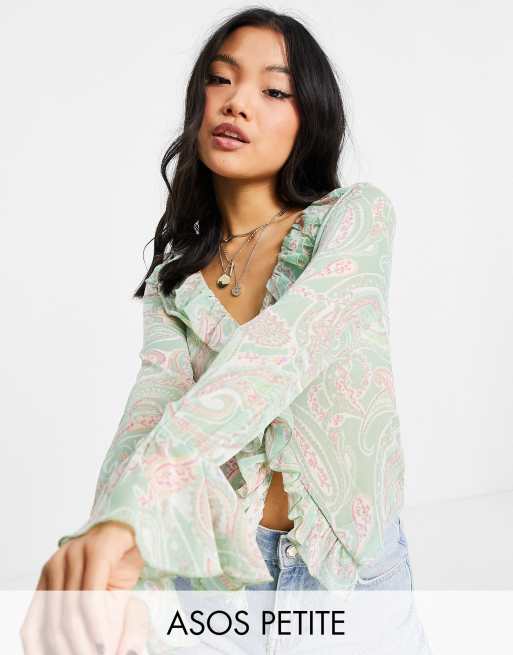 ASOS DESIGN Petite sheer long sleeve blouse with ruffle detail in paisley print