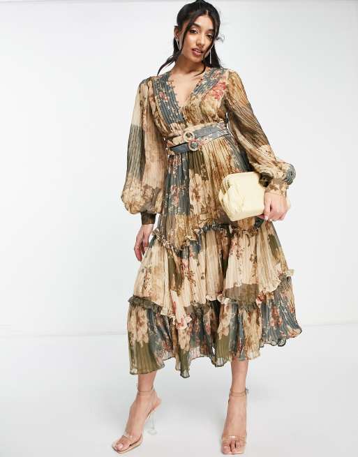 ASOS DESIGN pleat detail midi dress with patchwork print and double belt detail